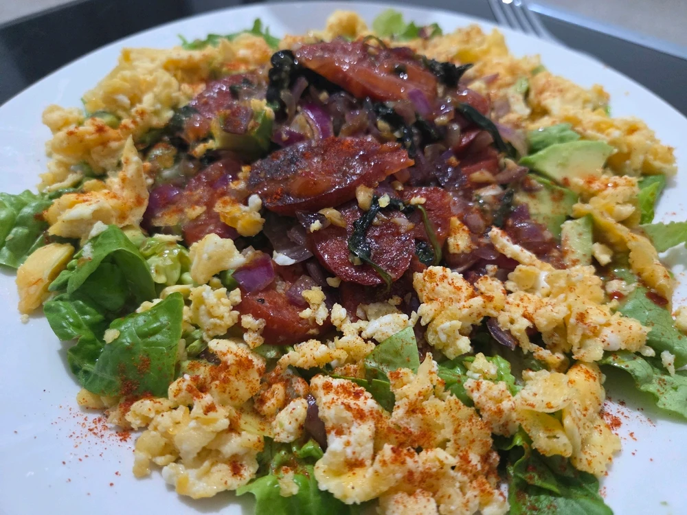 With avocado, onion, spinach, garlic, iceberg lettuce, lemon juice, Thai sweet chilli sauce and cayenne pepper 🌶 (edited)