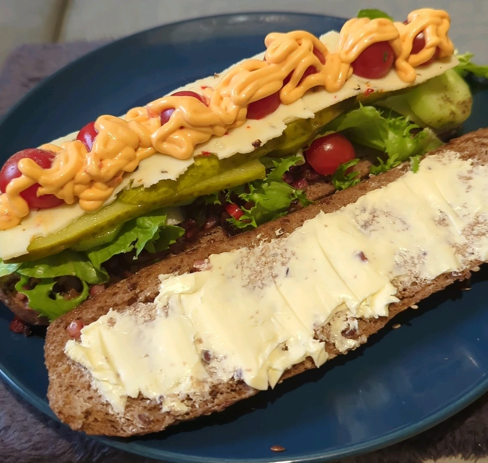 Grass Fed Bison Cheeseburger w/swiss on Dave's Killer Buns🍔 Topped with spinach, lettuce, hummus spread, and avocado Side of sweet potato fries🤘