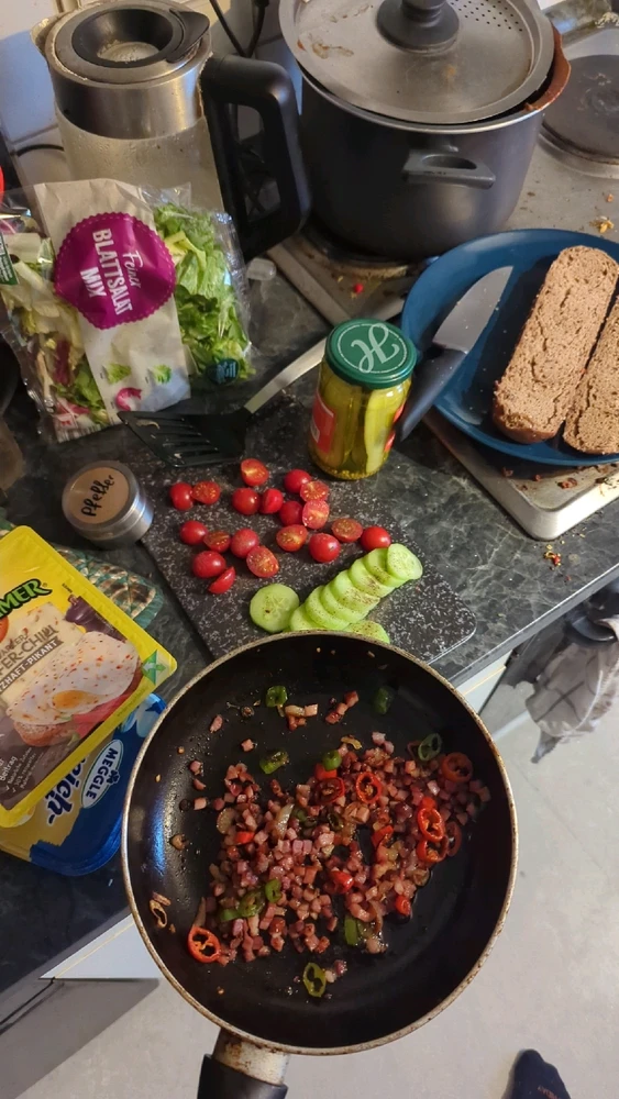 Bacon, jalapeno, lettuce, tomato, pickles, cheese, sauce.