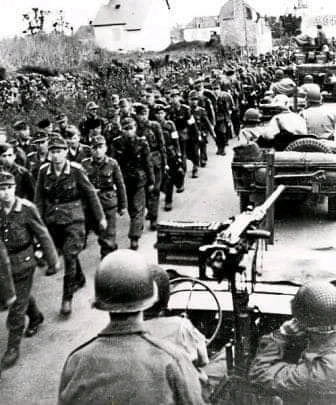 May 9, 1945 #OTD World War II: The German garrisons at Dunkerque (12,000 men), La Rochelle, Lorient, and Saint-Nazaire surrendered. Pictured: American soldiers and vehicles passing German prisoners of war, Lorient, 1945.