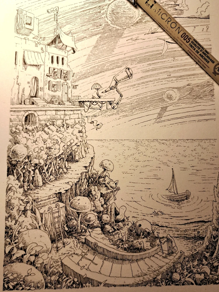 I always liked those rich drawings as a kid. Where ever you look there was something more to discover that makes you wonder for a long time. Here is something in those lines, I call this mass doodling style. It is not yet finished but getting there:)