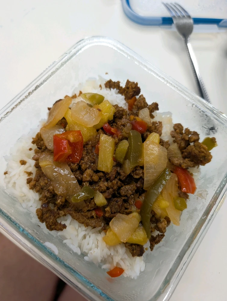 Starting making this for lunch this week & I think it's one of my favorite meals I've ever made!! Abbot's ground "beef", rice & sweet & sour veggies! ABSOLUTELY 🔥🔥!!