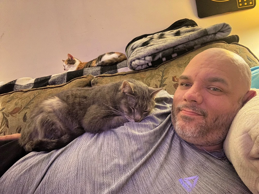 My babyboy laying on my chest, loves to cuddle when I’m watching TV or laying in bed. Merci is never to far behind.