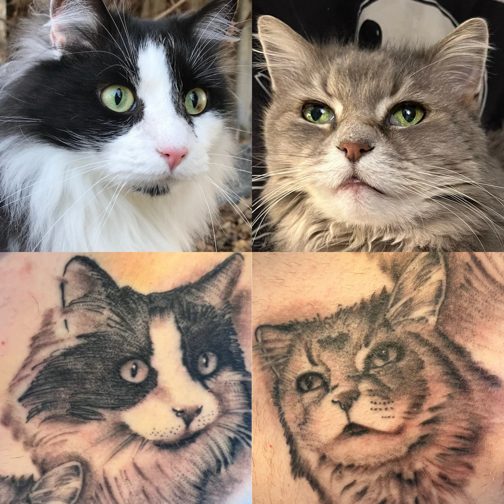 Got two of my past cats over my heart and started a sleeve of each cat with a pop culture character! So have my cat Joxer as Michelangelo and Michelangelo dressed as Joxer from Xena Warrior Princess.