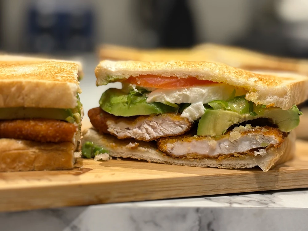 Panko crusted fried chicken, avocado, mozzarella and tomato