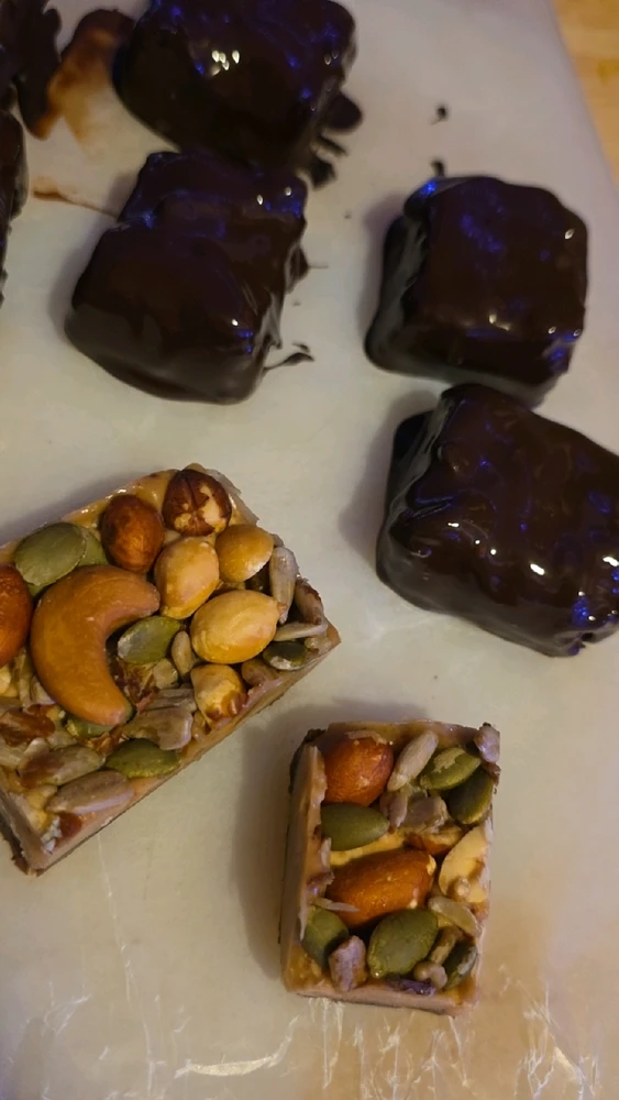 I made my own chocolate bars at 3:00 in the morning. Why? Because I can. 😂🍫 The base is coffee soaked dates, layered with natural peanut butter and mixed stuff on top. All dipped in dark chocolate and sprinkled with sea salt after! I made them all different sizes cuz I just need one little... read more