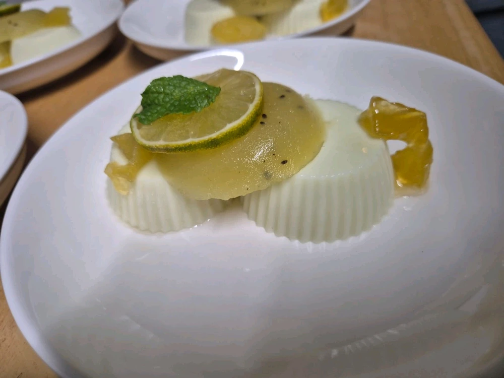 Homemade panna cotta with a kiwi Apple jelly and candied Apple bits.