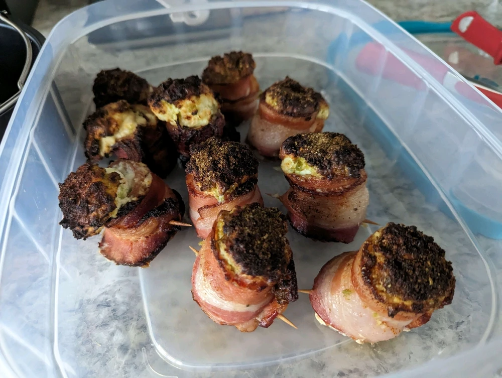 Butcher cut black pepper bacon Kielbasa for the base of the shots Jalapeno minced Good old Philadelphia cream cheese Little bit of onion, minced Shredded cheese fiesta blend. Air fryer for like 15 minutes. You got one of the tastiest events, snacks you can make. Use paprika to get the crust... (edited) read more