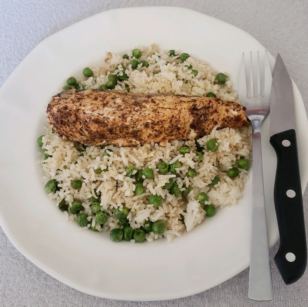 Simple rice and salmon in spices (salt, pepper, sumac, paprika, garlic powder, chilli flakes, herbes de provence and lemon) 🤌🏻