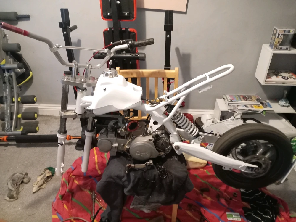 Well the frame is resprayed and re welded, all put together other than 1 bolt that's snapped off inside the lower top yolk. Will be fun getting that out -.-. Hope everyone is having a good day