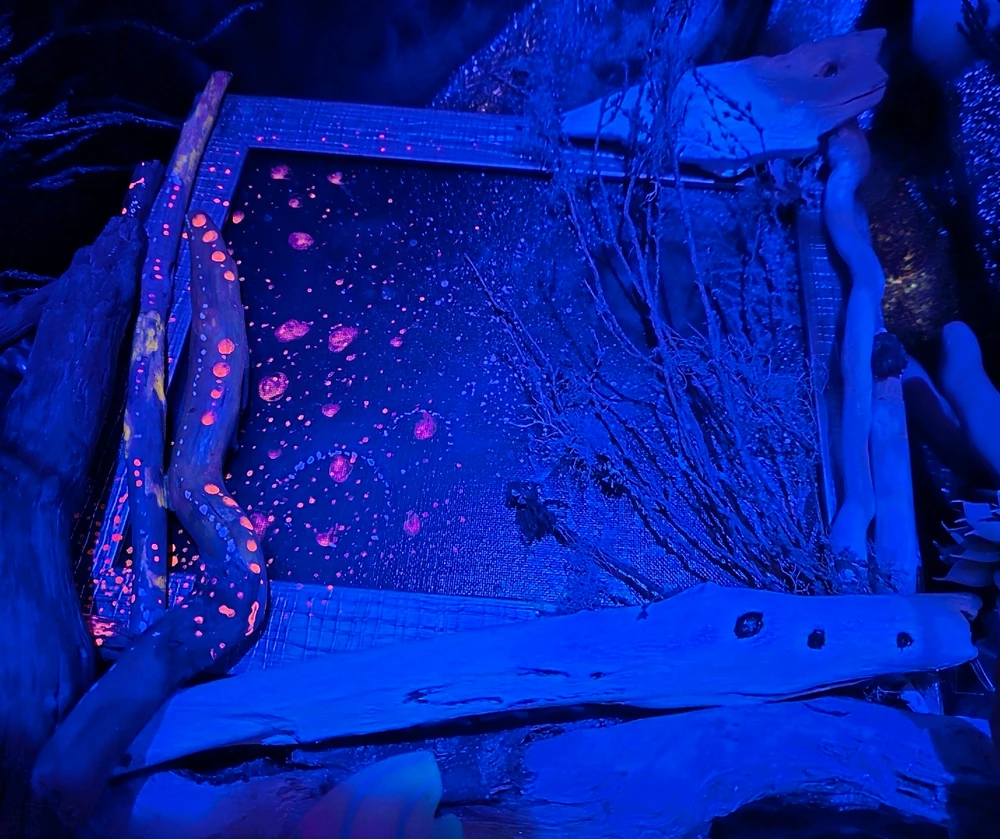 Multimedia art made from a thrifted frame, foraged and found objects, UV reactive paint, and acrylic paint on canvas and driftwood. Made this for a spooky themed show in 2023, but didn't get in, so it's been displayed in my studio window. Don't mind the window cling in the background. It lost... read more