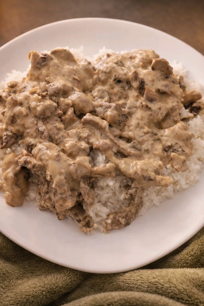 Beef stroganoff with rice. 100% tasty.