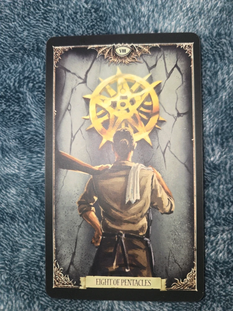 So, I got 5 of Coins again I'm thinking that this is just hardening to some rent issues I'm having And then 8 of Swords (Upright)- Keyword Isolation kinda stuck out to me. Maybe I'm not quite feeling like I have the support network that I know I do. Emotions are weird man.