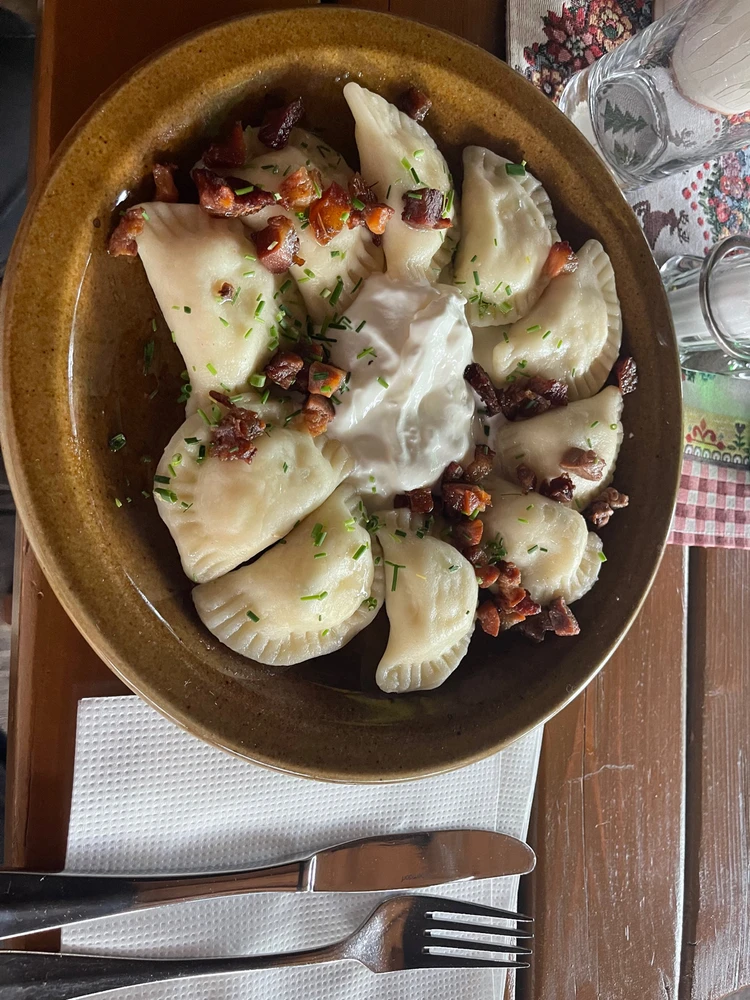 Real pierogi like sheep cheese filled pasta with cottage cheese and bacon 😍 True Slovakian delicacy in the Koliba restaurant