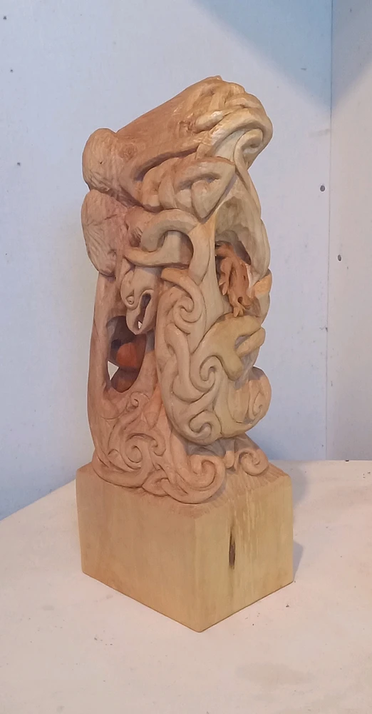 I don't often work in the 3d, I would say most of my works are 2d wall sculptures โบ This one, hacked out of Poplar and I added animal figures of teak wood.